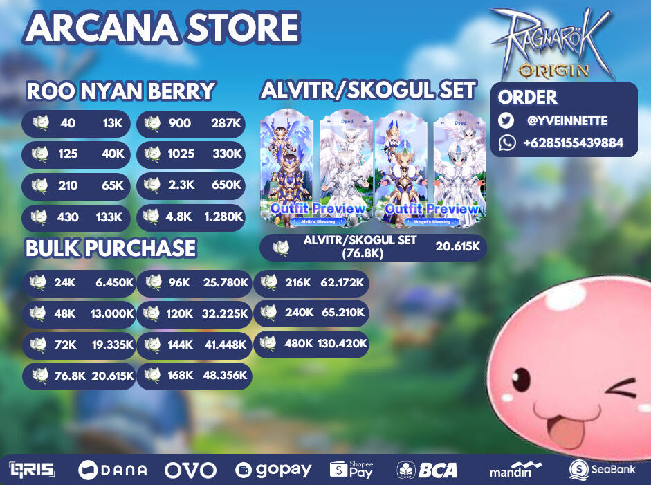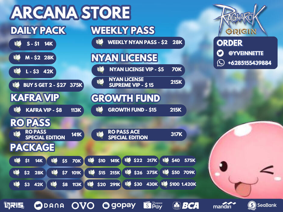 Top Up Nyan Berry ROO, Alvitr/Skogul Set, Daily Pack ROO, Weekly Nyan Pass ROO, Nyan License ROO, Kafra VIP ROO, Growth Fund ROO, RO PASS, RO PASS ACE, Package ROO